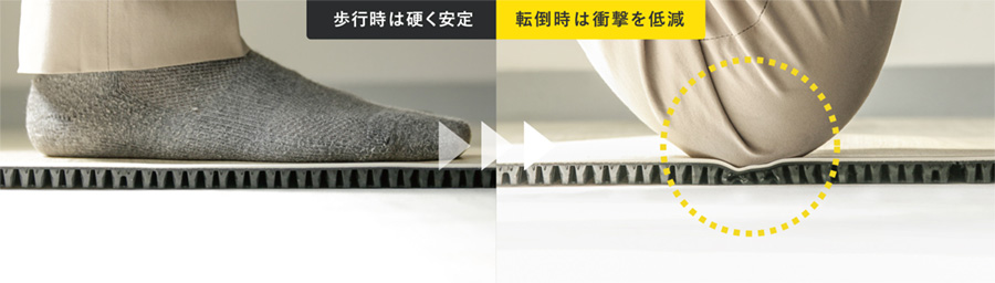 普段は歩きやすい硬さで、転倒すると衝撃を吸収。