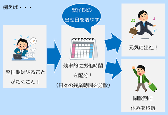 導入されたのが「1年単位の変形労働時間制」。年間で事前に休日を設定し、繁忙期は出勤、閑散期は週4日勤務など柔軟に働ける仕組みです。さらに「シフト勤務制」では始業時間を8〜13時の間で選べる制度を整備。これにより、業務のピーク時間に合わせた効率的な人員配置が可能となりました。