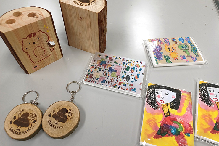 実際に山に入って木を伐るのは、林業のプロでないと難しいです。そこで、私たちは地域の方や行政の方から間伐材をご提供いただき、それを加工する作業を担っています。まず初めに、いただいた間伐材を職員がチェンソーで玉切りにして、その後の薪割りや運搬などの作業を利用者さんに手伝っていただきながら、薪棚に並べて乾燥します。この薪棚も大工さんに指導してもらって、自分たちでつくりました。商品化としては、利用者さんが中心になって、ストラップやネームプレートにオリジナルの焼き印を押して、地域のマルシェで販売しています。「次は鉛筆立てをつくろうか」など、会議で意見を出し合ってグッズを決めています。マルシェでたくさんの方が喜んで買ってくださって、利用者さんも私たちもとても楽しんでいます。商品化では、木の本来の良さを活かしたものづくりを志しています。そのため、林業見学ツアーに参加し、木のことも学びながら取り組んでいます。