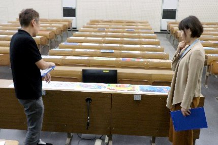 選定にあたっては、丸山理事長、原田学長、教育・心理学部の江村教授、松下教授のほか、本学卒業生であり、障害者アートの推進に取り組む医療法人清明会PICFA(佐賀県)施設長の原田啓之氏による審査を実施しました。