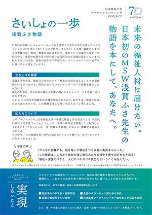 このプロジェクトは、日本福祉大学の学園広報室と学生有志による「次世代 の福祉人材育成プロジェクト」です。本学の周年記念事業として制作したラジオドラマ『さいしょの一歩 浅賀ふさ物語』をもとに、書籍化を進めてきました。その中で、「この物語を若い世代に届けたい」という想いで、本プロジェクトが立ち上がりました。