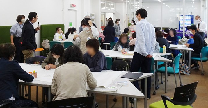 第2部では、ワークショップ「みんなですてきなまちをつくろう!」を行いました。1畳ほどの大きな紙に、参加者それぞれが自由な発想でまちにほしいものを描きました。世代ごとに異なる思いの詰まった素敵なまちができ上りました。