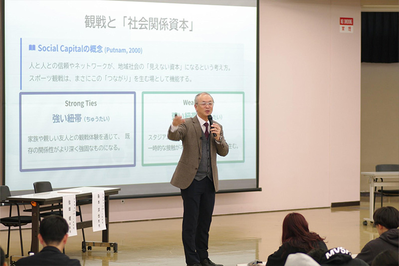 2025年度は、本学スポーツ科学部住田健准教授のコーディネートのもと、大阪体育大学の藤本淳也教授による基調講演「観戦文化が地域を育てる〜 スポーツを媒介とした地域活性化の可能性 〜」が行われました。講演ではグラノヴェッターの「弱いつながり(社会的紐帯理論)」が引用され、スポーツ観戦が人々を緩やかにつなぐコミュニティを形成することで、新たな市場の創出や地域経済の活性化に寄与するという、スポーツ社会学の多角的な知見をいただきました。
