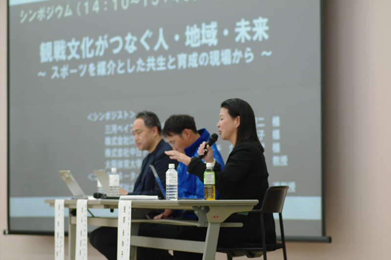 続くシンポジウムでは、「観戦文化がつなぐ人・地域・未来〜 スポーツを媒介とした共生と育成の現場から 〜」をテーマに、大阪体育大学スポーツ科学部の藤本教授の他、地域スポーツの最前線で活躍する3名のスペシャリストが登壇しました。