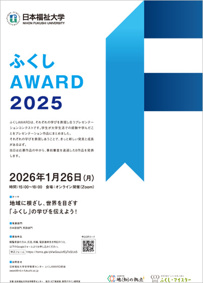 2015年度から始まった、通学学部生を対象とした学内プレゼンテーションコンテストの第11回目となる「ふくしAWARD 2025」を1月26日(月)に開催します。