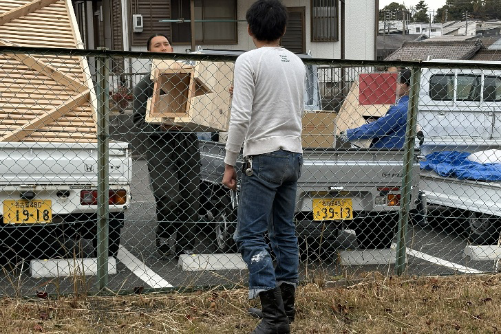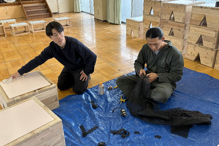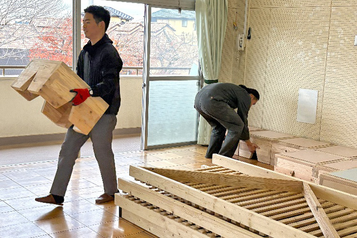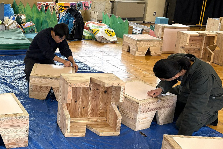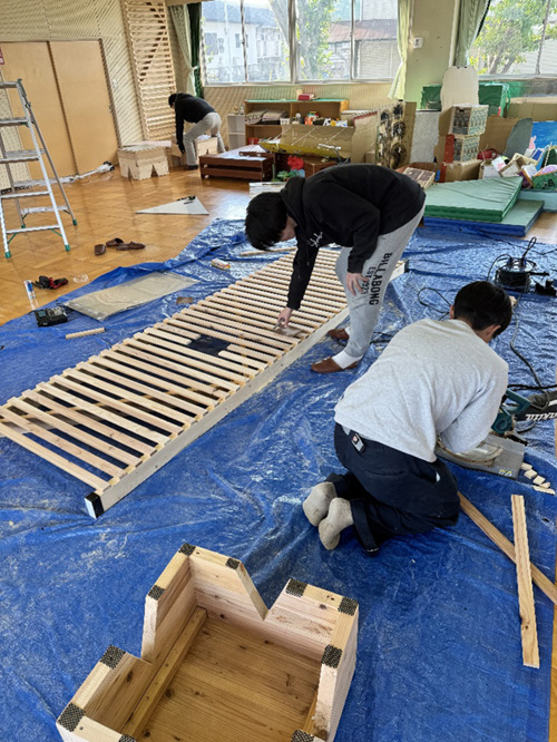木材の切り出し、パーツの制作は半田キャンパスで作業し、パーツを保育園に持ち込んで、2日がかりで設置しました。設置前に、子どもたちがケガをしないようにさらに家具の角のヤスリがけや滑り止めの貼り付けを行ったため、予定外に時間が掛かってしまいましたが、園長の長谷川佳子先生には休日にも関わらず設置の間、ご丁寧なご対応をいただきました。