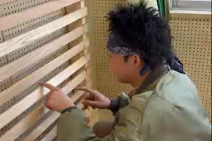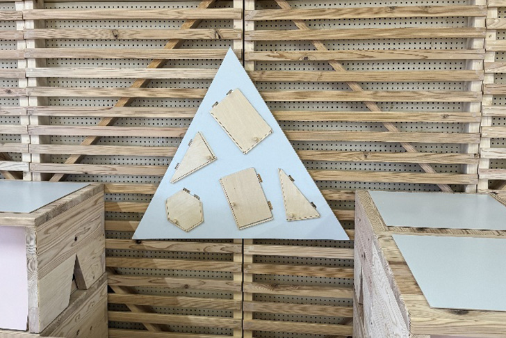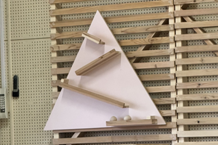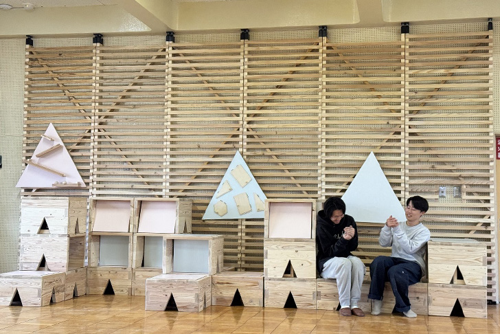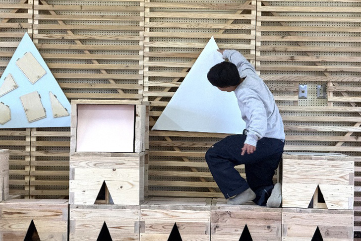 出来上がった家具は組み合わせで自在に形が変わり、椅子や絵本棚などに活用できる実用的なデザイン。バックの横格子の取り付け壁には、「玉転がし」「秘密の扉」「お絵描きボード」が取り付けられ、一部の壁の格子はクルクル回すことができるなど子どもの遊び心をくすぐるデザインになっています。