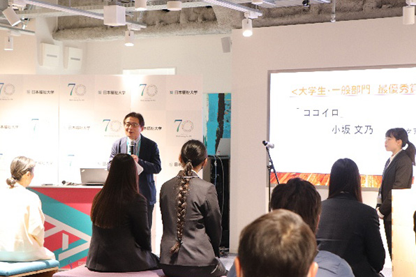 表彰は、大学生・一般部門、続いてU-18部門の順で実施。各作品はパネル展示され、受賞者がアイデアの背景や工夫点を発表した後、実行委員の教員が講評・コメントを行い、表彰状が授与されました。