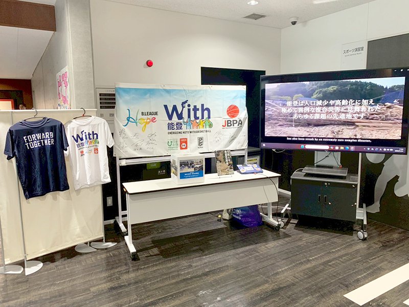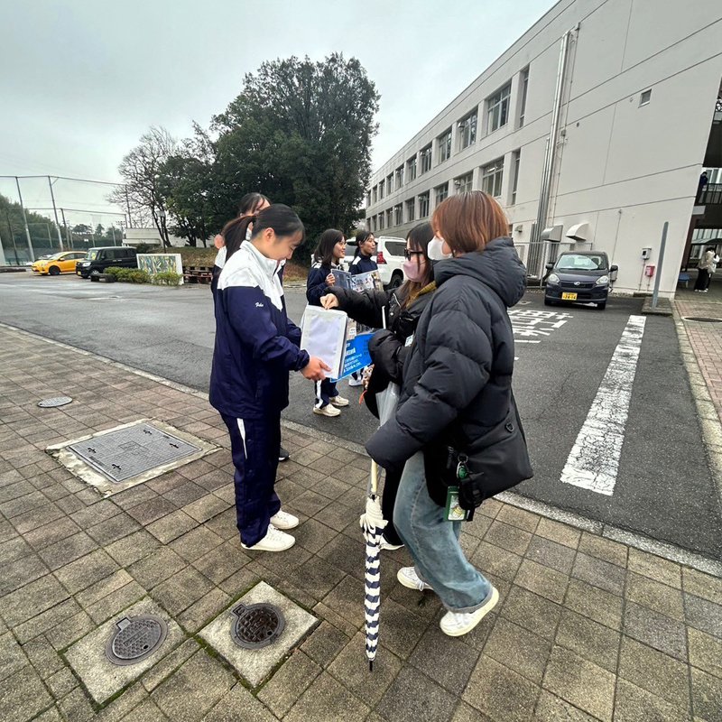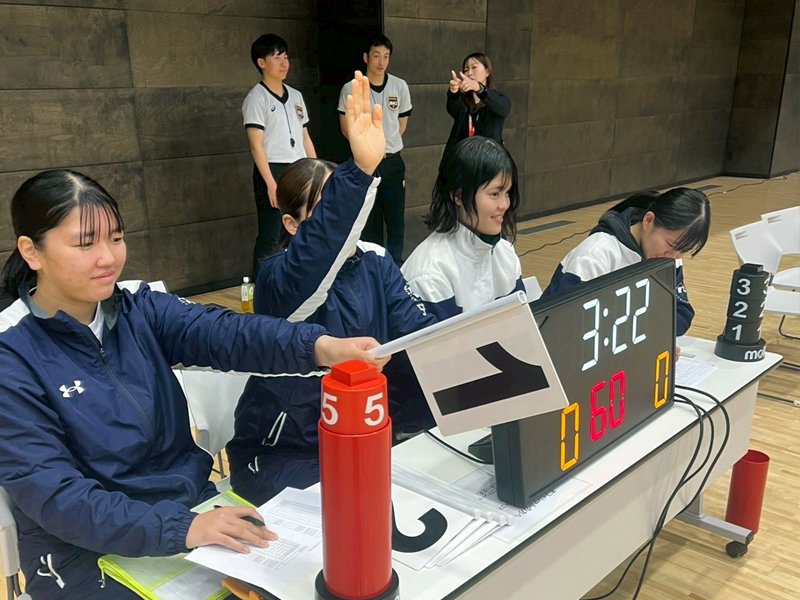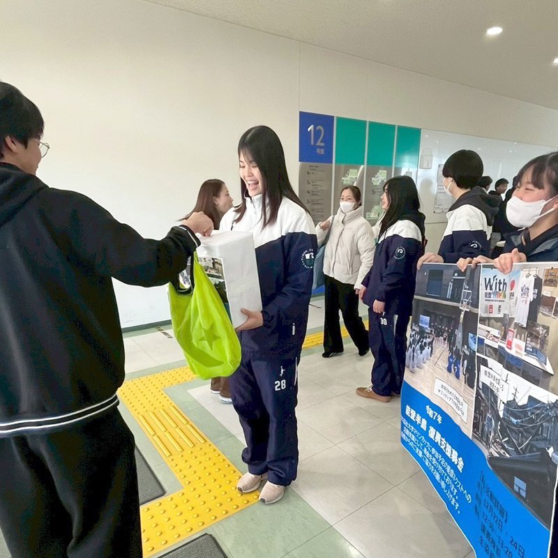 昨年に引き続き能登復興支援大会として開催し、被災から復興に向けての経過を会場入り口に掲示したり、募金活動を行ったりしました。12月末には学内でも募金活動を行い、多くの学生・教職員からご理解と協力をいただきました。試合当日に行った募金活動と併せて参加した能登ネクストさんにお渡しさせていただきました。