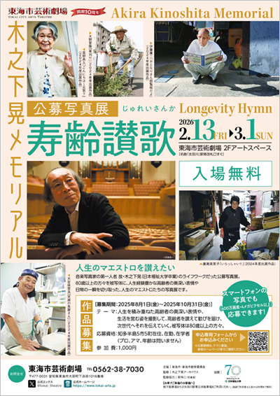 80歳以上の方々を被写体とした東海市芸術劇場の公募写真展「寿齢讃歌」は、音楽写真家 故木之下晃氏の「カメラを向けることで、お年寄りにもっともっと輝いてもらいたい、笑顔で元気に長生きをしてもらいたい...」との想いから立ち上がった企画です。
