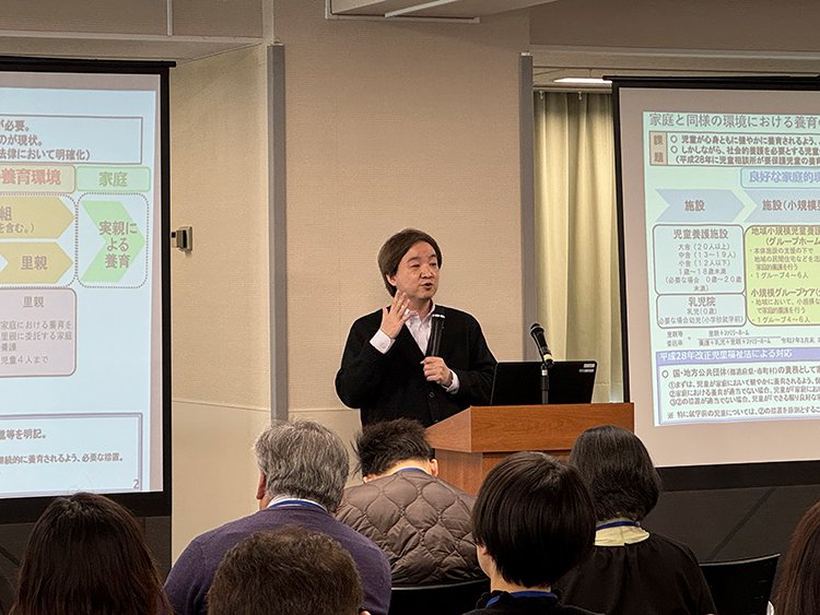続いて、社会福祉法人二葉保育園 二葉乳児院 院長の長田淳子氏による「里親支援センターネットワークについて」の講演が行われ、全国で進みつつある里親支援センターの取り組みや、関係機関が連携してネットワークを形成することの意義について共有されました。