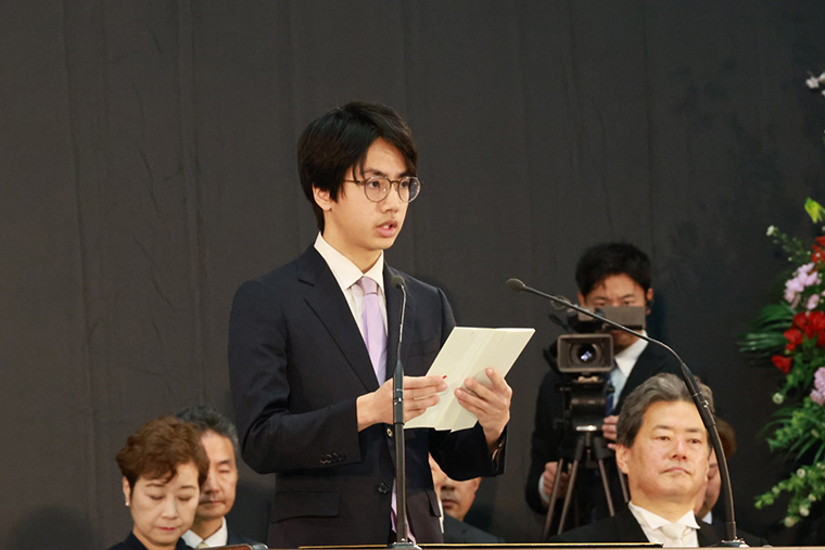 在学生を代表し、経済学部経済学科の除本泰斗さんが登壇し、新入生へ歓迎の言葉を送りました。