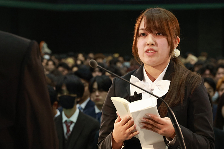 新入生を代表して、大学院看護学研究科の石川智暉さん、スポーツ科学部スポーツ科学科の請島心愛さんが、それぞれ誓いの言葉を述べました。