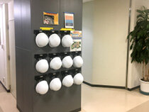 研究本館の耐震性を高めるために、1Fエレベーター前の柱を耐震補強し、3Fミーティングルームには鉄骨を用いた補強をしました。