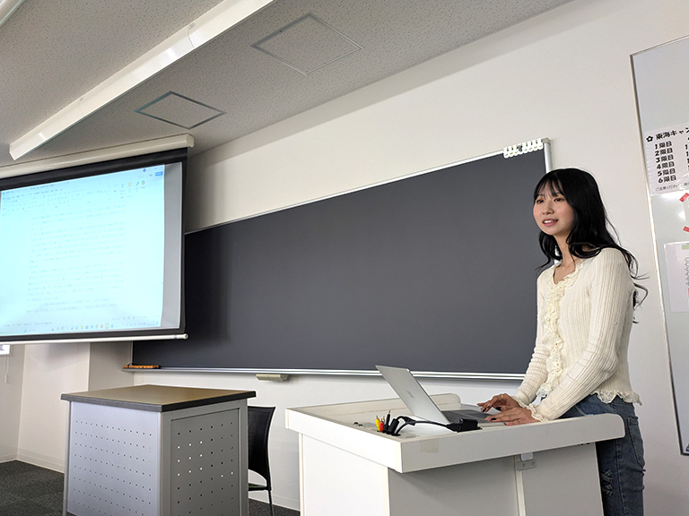 ゼミ活動では「女性と貧困」をテーマに、生理用ナプキンをキャンパス内に設置する取り組みを行いました。男子学生の前で月経について話すことに最初は抵抗がありましたが、理解しようとする姿勢に触れ、むしろ自分自身の無意識の偏見に気付き、価値観を見直す機会となりました。