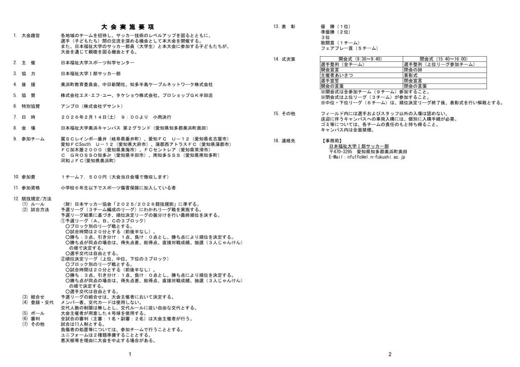 本大会は、各地域のチームを招待し、サッカー技術のレベルアップを図るとともに、選手(子どもたち)間の交流を深める機会とするほか、日本福祉大学のサッカー部員(大学生)と本大会に参加する子どもたちの親睦を図る機会として2008年度から開催しています。