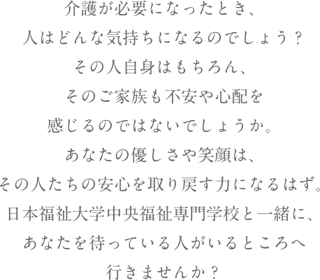 誰もが真剣に考えなくてはならない深刻な問題に直面している今、「すべての人のしあわせ」のための、福祉社会の実現のために「福祉力」が必要とされています。今や社会福祉分野だけでなく、ビジネス、経済、教育、医療等さまざまな領域で福祉のチカラが求められているのです。日本福祉大学グループでは福祉力を備えた人材を社会に輩出し、これからの社会を支えていくことを目指しています。