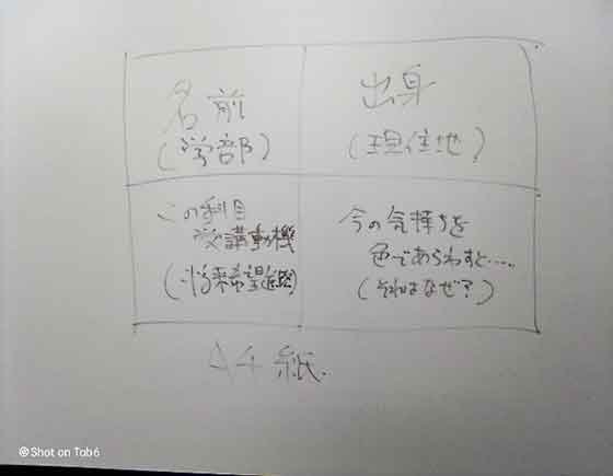 - 最初の自己紹介で、先生から「今の気持ちを色でたとえると?」と訊かれたが、自分と同じ「青色」を答える学生が多かったので緊張しているのは自分だけではないとわかって安心した。しかし自分も他の学生のように青色のような淡い色から赤色のような激しい色のような心情で講義に臨みたいと思う。