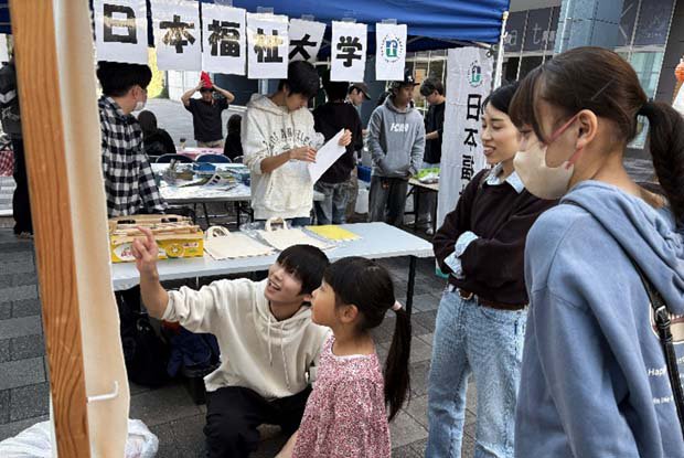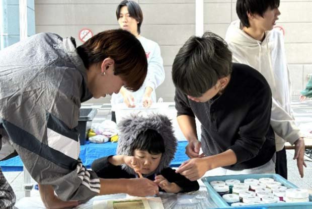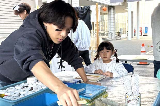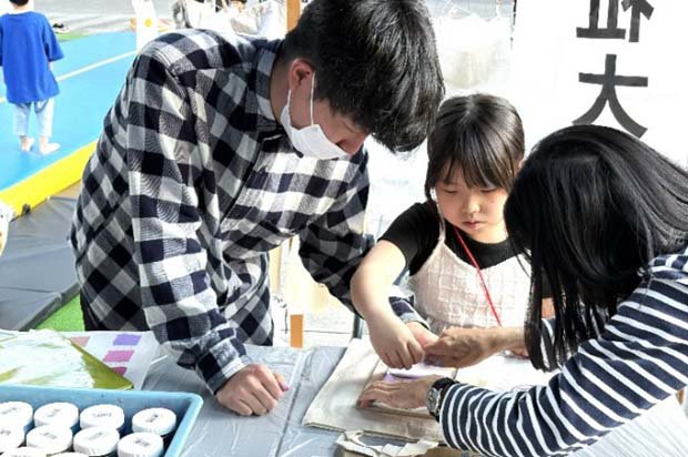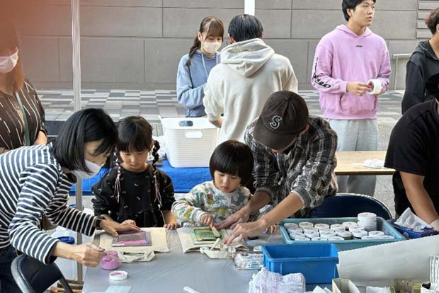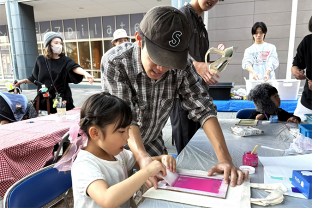 「地域研究プロジェクト」を履修する経済学部2年の学生12名が、太田川駅前の大屋根広場で東海市が主催する「遊べるおおたがわ」に出展し、子どもたちにシルクスクリーンのプリントを体験してもらうワークショップ「シルクスクリーンでオリジナルバッグづくり」(令和7年度東海市大学連携まちづくり推進事業採択事業)を行いました。使用した版は非常勤講師の大塚泰子先生の指導のもと講義で学生たちが制作したもので、地元の幼児・小学生ら約100名がシルクスクリーンでプリントしたマイバッグ作りを楽しみました。