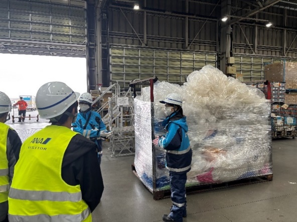 ANA中部貨物上屋では実際にプラスチックフィルムがどんな使い方をされているか、プラスチックフィルムの排出までの大まかな流れを教えていただきました。