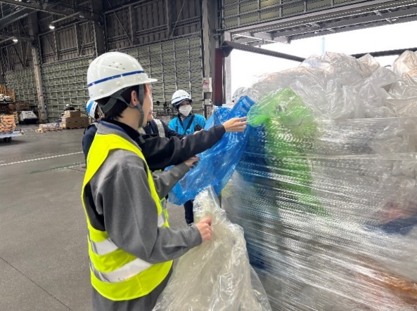 貨物によって使用されているプラスチックフィルムの色や特徴、性質が違うこともあるということも知りました。写真にあるように、大半のフィルムは無色透明ですが、青、赤、緑など色が入っていたり、シールなどが貼られていたりなど、本当に多種多様なフィルムがありました。シールなどをきれいに除去しないと再生・再利用化できないため、そのための分別の難しさを実感できました。