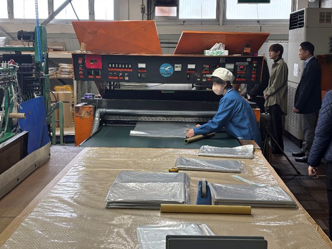 当日は、大竹社長より、全日本空輸(ANA)が使用した航空貨物用のストレッチフィルムを回収し、空港内で使用するゴミ袋や配布用バッグへ再生する取組についてご説明いただきました。