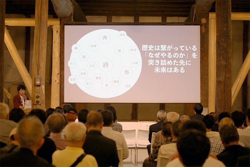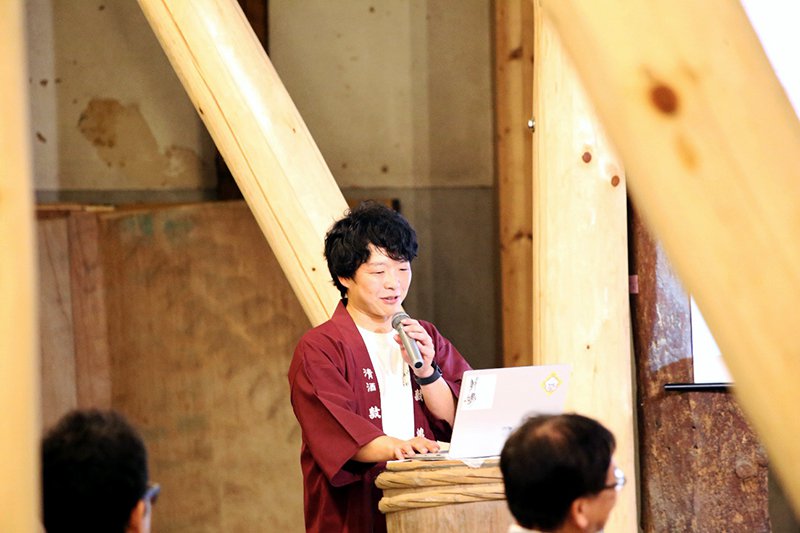 「亀崎の伝統と革新」をテーマに据えて、基調講演は、伊東株式会社 代表取締役社長の伊東優氏から「複合施設「伊東合資」を軸とした地域の活性化」と題してお話しを頂きました。かつて日本酒「敷島」の老舗だった伊東合資の休業からご祖父様が他界されて気づいた「敷島」の価値、そこからの酒蔵の復興。その後、亀崎酒造祭や蔵シカルmarchéのイベント実施などを経験し、「イベントで文化はつくれない」と痛感されたことから、文化を創るためには、「営み」であることが必要なのではないか、と想いを巡らし、新たな事業展開を見据えているお話まで、これまでの軌跡を丁寧に紡いだ先にある未来への更なる挑戦を、会場中が夢中になって聞き入っていました。