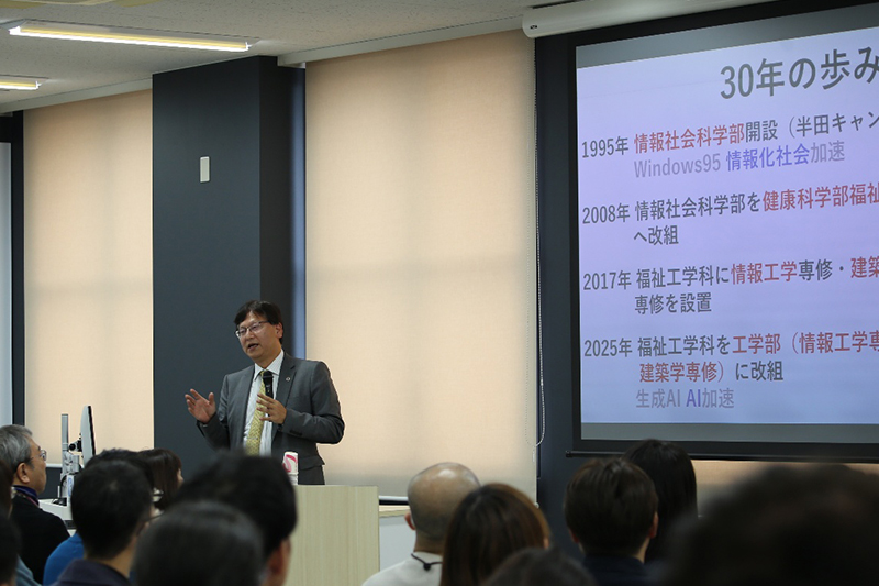冒頭に福田秀志工学部長より半田キャンパス開設30周年記念の挨拶がなされ、その後、記念講演会、ミニレクチャーに移りました。今回の企画にご登壇いただきました講師の方々は、以前は半田キャンパスで教壇に立ち、多くの卒業生のみなさんに対し熱心にご指導をいただきました先生方です。