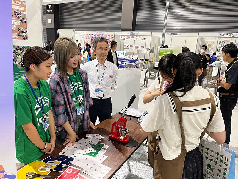 今回のEXPOは「子ども・ユース世代の力で進めよう~アジアを知ろう・アジアから始めよう~」がテーマのため、アジアの複数の国の留学生と共修している国際学部が普段取り組んでいる様々なことをパネルや動画で紹介しました。大きな会場内には、SDGsに取り組んでいる企業のほか、高校や県内外の大学からの出展も多く、参加者同士がお互いの取り組みを紹介し合うなどの交流もはかられました。