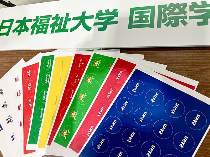 国際学部のブースには、留学生の出身国の言葉で書かれた「世界のこんにちはの缶バッジづくりコーナー」も設けられました。多くの子どもたちや高校生が色とりどりの缶バッジ作りに挑戦しながら、「ネパールってこんな文字なんだ!」「どうやって発音するんだろう」など盛り上がっていました。