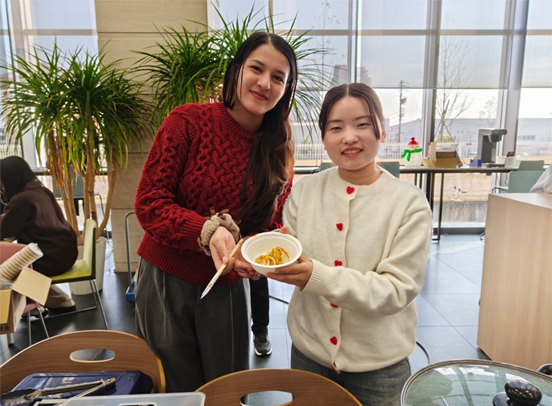 来場者からは「モモを初めて食べた!」「辛いけどおいしい」「チャイのスパイスが効いて暑くなってきた」といった声が上がり、おいしい国際交流も行われました。それぞれの商品の背景にある文化について、学生が直接説明する場面も見られ、母国の味を再現しようと奮闘する留学生たちの姿が印象的でした。