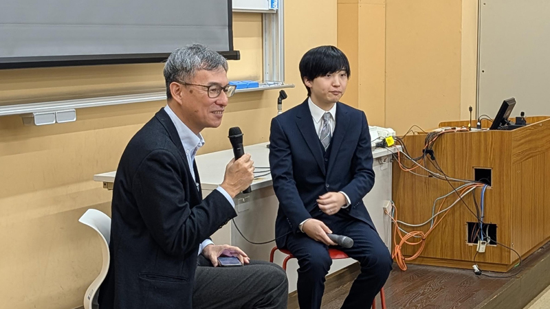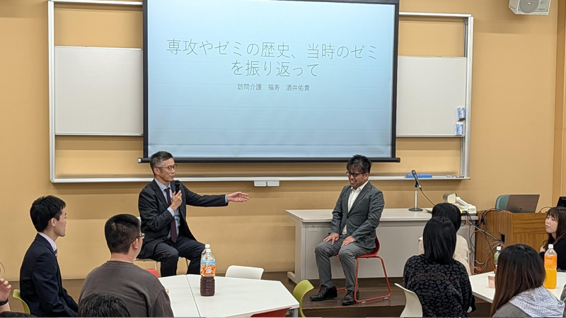 山中ゼミ5期生の酒井佑貴氏が山中武彦学部長とともに登壇され、現在のお仕事のお話や当時の学生時代について振り返られました。卒業後、長野県の病院で勤務された酒井さんですが、病院で提供できるリハビリテーションに限界を感じ、訪問介護・訪問入浴事業を新たに立ち上げられました。山中学部長より学生時代の思い出について聞かれると、「学生時代は井の中の蛙で、本当に世界を知らなかった。作業療法もいろんな分野があり、作業療法の世界を学生時代にたくさん学んでいれば、その後の間口も広がっていたかもしれない。」とお話がありました。