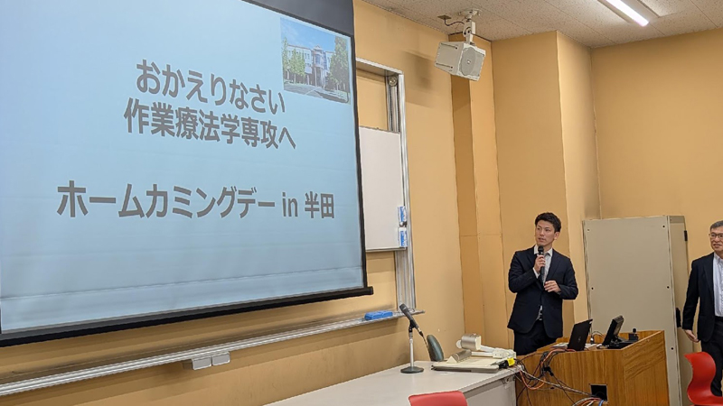 作業療法学専攻のホームカミングデーは、作業療法学専攻1期生である野口貴弘助教の司会進行のもと、30名程の参加者とともに和やかな雰囲気でスタートいたしました。