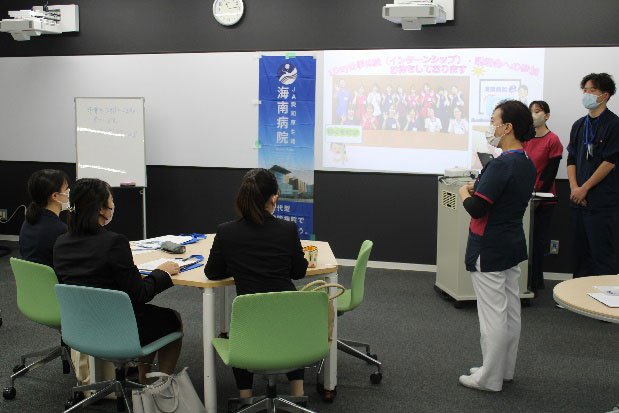 当日は感染対策に留意しながら、前半は各病院の方々から3分間の施設プレゼンテーションをしていただき、後半は参加病院が各教室に分かれ、関心を持った医療機関に学生が個別訪室し、施設の特徴、看護体制、キャリアラダーや就職試験などについて伺わせていただきました。