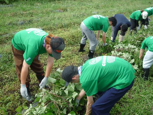 農作業体験では、サトイモをはじめ様々な農作物を栽培されている阿部さんの広大な畑へ。8月で収穫前ということもあり、今回はサツマイモのつる返しという作業を体験しました。短時間ではありましたが、農業の大変さとありがたみを実感しました。