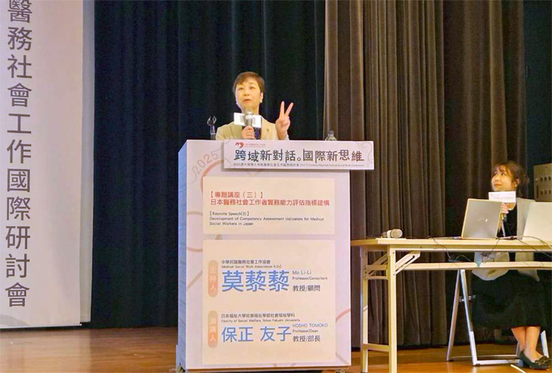 2025年11月21日〜22日、台湾・実践大学(台北市)で開催された「2025台湾医療ソーシャルワーク学会」に、本学社会福祉学部長 保正友子教授と大学院生・卒業生ら5名が参加しました。参加しました。今回の学会では、保正教授が日本の実務能力評価指標について講演するとともに、大学院生が台湾の医療機関・大学と意見交換を行うなど、日台双方の専門職教育と実践の連携を深める貴重な機会となりました。