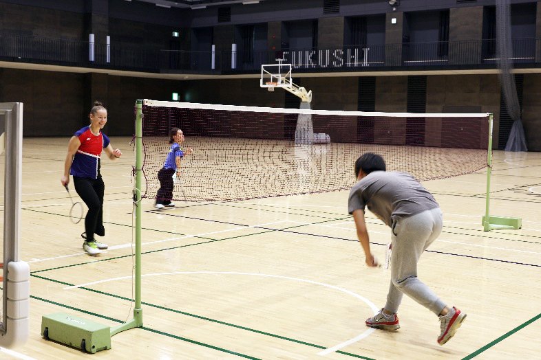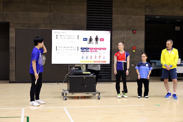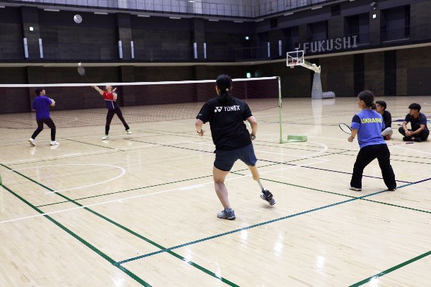10月22日(火)、日本福祉大学美浜キャンパス内のトレーニング施設「SALTO」において、ウクライナから来日したパラバドミントン選手2名とコーチ1名が、スポーツ科学部の授業「バドミントン指導法演習」に参加しました。