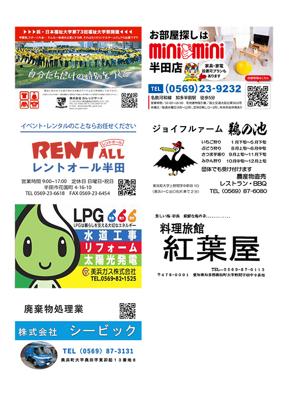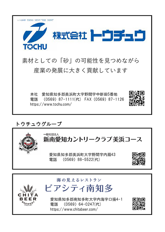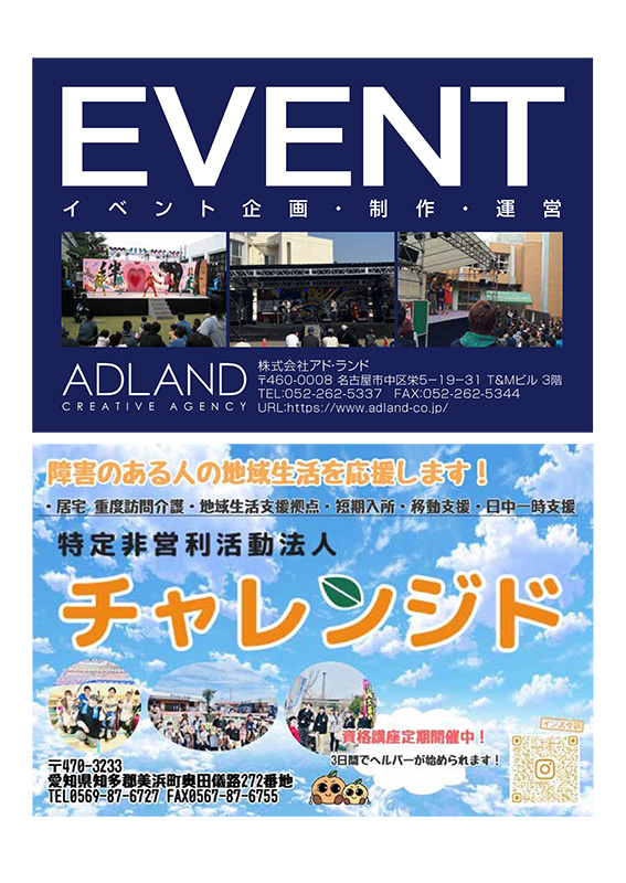 今年度ご協賛いただいた企業様は、こちら。株式会社トウチュウ、日本福祉大学 入学広報課、株式会社エヌエフユー、株式会社アドランド、特定非営利活動法人チャレンジド、美浜サーキット、みどりの風 南知多病院、特別養護老人ホーム知多共愛の里、知多自動車学校、amusementpark OCTOPUS、石川医院、株式会社カレッジヤード、株式会社ミニミニ半田店、株式会社レントオール半田、ジョイフルファーム鵜の池、美浜ガス株式会社、紅葉屋、株式会社シービック、地域福祉サポートちた、知多半島ケーブルネットワーク、ism、シーガル、フレベールラデュ、ベルファミール、渡辺病院、海鮮創作酒房 湾、株式会社協同宣伝、美浜サーキット、都館・みやこ食堂等