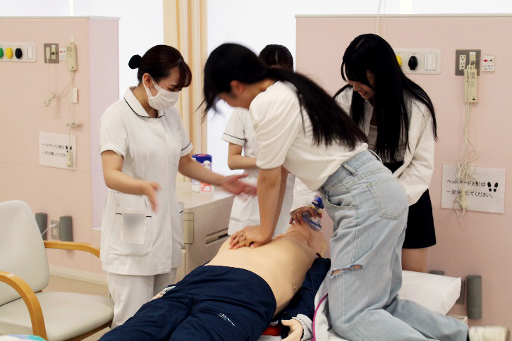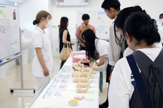 災害時の多文化・多言語環境を想定し、看護学部と国際学部の学生が4つのグループに分かれて「通訳支援役」や「看護師役」などの役割を担い、外国人被災者の健康確認と情報収集をロールプレイを通じて行います。