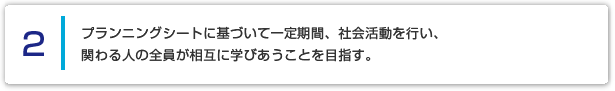 このプログラムは、プランニングシート(活動計画書)に基づいて、一定期間社会活動をおこない、関わる全ての人々が相互に学びあうことができるよう活動をおこないました。より具体的な目標として、下記5つの活動目標を設定しました。