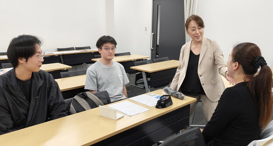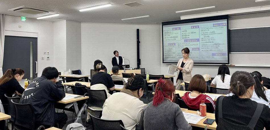 2025年10月16日(木)に、日本で働くことを目指す留学生のための「就職活動準備セミナー」と「春季インターンシップ説明会」を開催しました。この日は、名古屋外国人雇用サービスセンター(以下、名古屋外セン)の2人(佐藤さんと大橋さん)が講師を務めました。