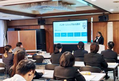 ディワーさんのインターンシップ先は中央高等学院でした。発表では、母国であるスリランカと日本の教育制度の違いを学んだり、教員という仕事は責任が大きいけれども生徒たちとの交流を通じてこの仕事のやりがいを感じたなど「人として大きく成長するきっかけになった」と話し、参加者から大きな拍手をもらっていました。