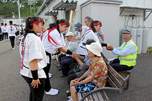 熱中症にならないようにと、和太鼓部楽鼓のメンバーがお茶を配って回ります。