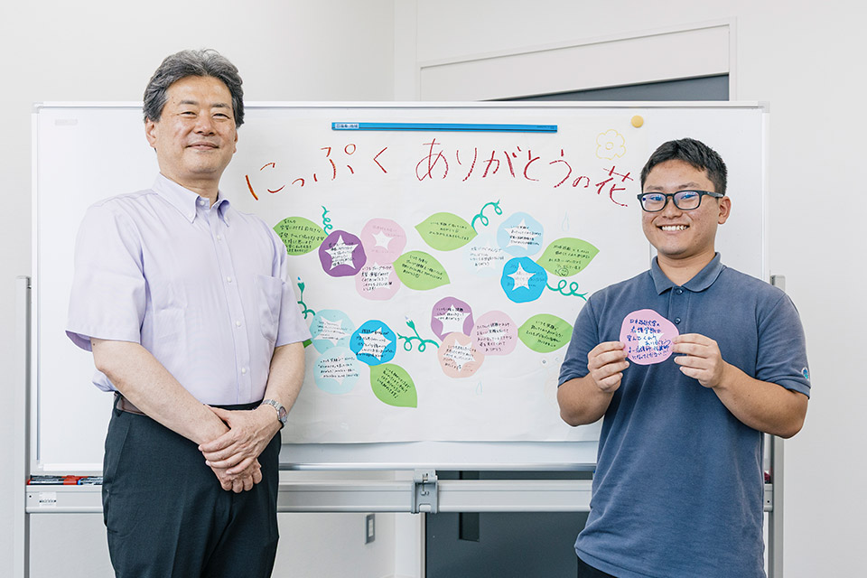 「にっぷくありがとうの花」という寄せ書きを作成しています。原田学長にもメッセージをいただきました。