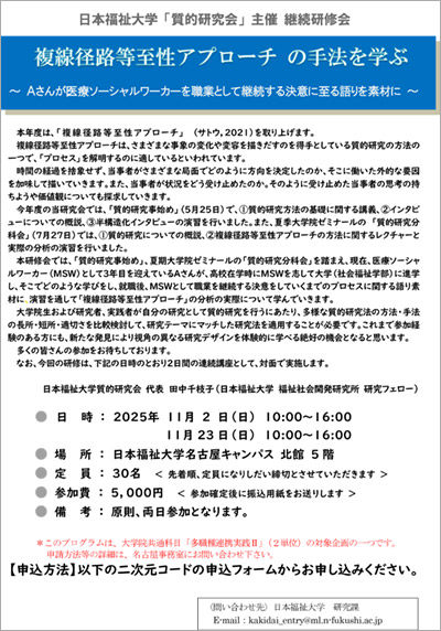 日本福祉大学「質的研究会」主催 継続研修会「複線径路等至性アプローチ の手法を学ぶ」~ Aさんが医療ソーシャルワーカーを職業として継続する決意に至る語りを素材に ~