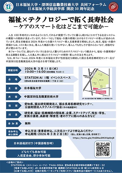 トップページ イベントカレンダー 日本福祉大学・深圳信息職業技術大学 共同フォーラム/日本福祉大学経済学部 開設50周年記念 「福祉×テクノロジーで拓く長寿社会 -ケアのスマート化はどこまで可能か-」