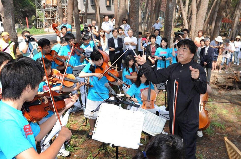 被災地で音楽を聴いてもらうのは、あまりにもきれい事のような気がしてためらっていましたが、岩手の根浜海岸にある宝来館という旅館のおかみさんが、もしも来てくれるのなら大歓迎したいと手紙をくださったのです。それなら自分の思いを最も伝えられるスーパーキッズ・オーケストラを連れていきたいと思いました。海と道路に挟まれた松林の中での演奏でしたが、大聖堂にいるような不思議な空気に包まれました。
