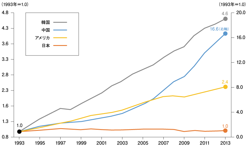 世界各国のGDP(国内総生産)の推移を比べると、日本はこの20年間、全く成長がありませんでした。一方、韓国は4.6倍、中国は16.6倍、アメリカも2.4倍成長しました。つまり、世界中が順調に経済成長している中で、日本だけが取り残されていたのです。それが「失われた20年」の重要な前提の一つとなっています。
