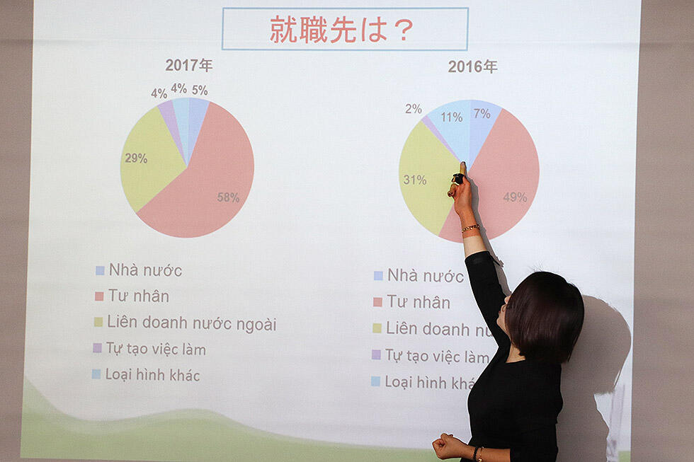 卒業生のほとんどが最も得意なのは「読む」ことで、問題を感じているのは「聞く」「話す」「書く」能力の順となっています。つまり、コミュニケーション能力を高めなければなりません。ベトナムでは、日本語の文法や語彙を1年間覚えさせてから、さまざまな知識を教育し、読み書きできるように指導します。また、日本人の教員もそれほど多くなく、聞いたり話したりする機会が少ないため、このような結果になったのではないかと思います。