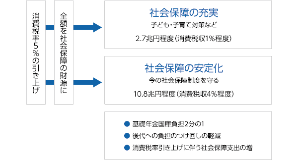 この改革では、消費税を5%引き上げ、1%(2.7兆円)程度は社会保障の充実に、4%(10.8兆円)程度は社会保険財政の赤字補填に使うことになっています。この赤字補填に使う部分では、国民のサービスを増やしません。つまり、今のサービスを、借金ではなく税で調達するだけなのです。